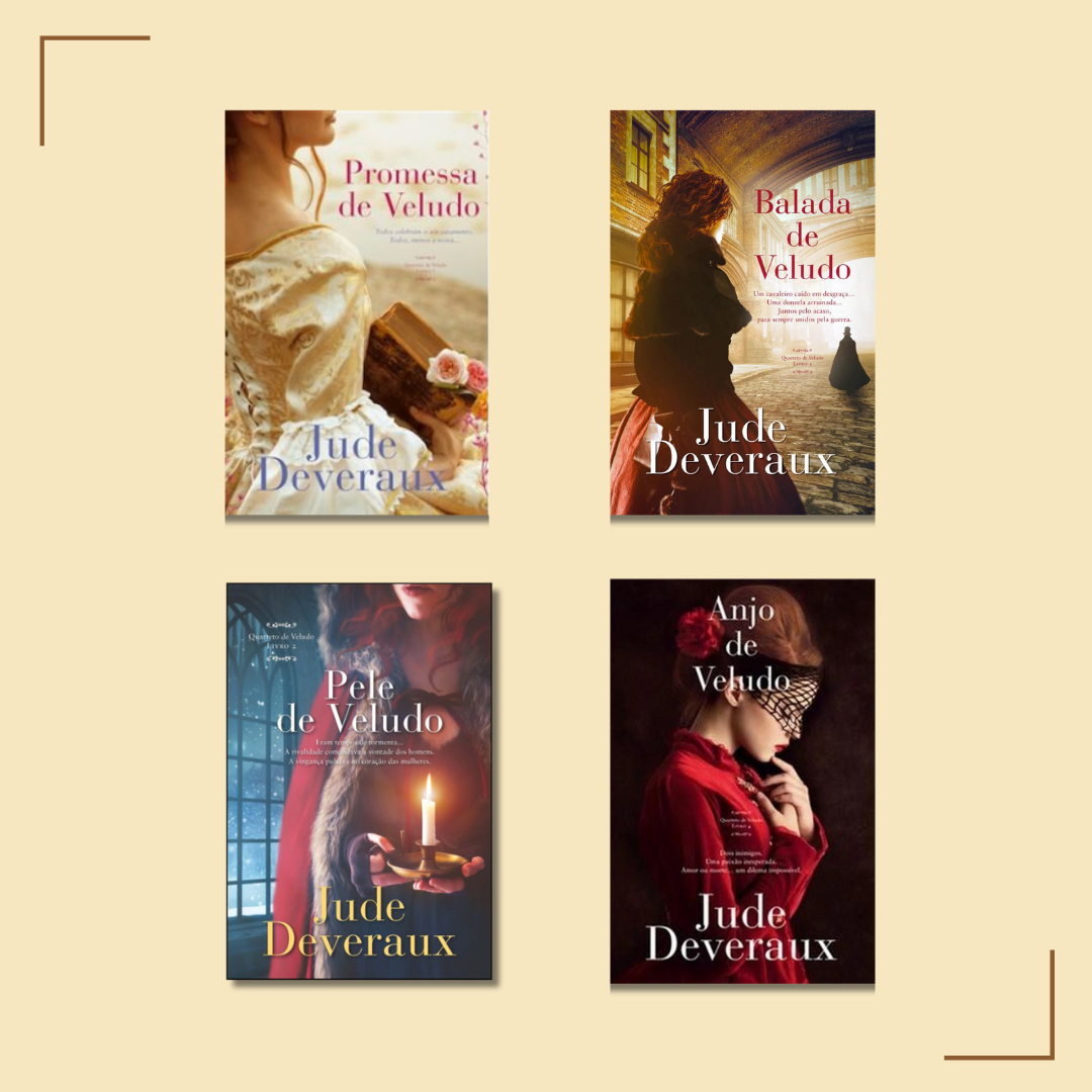 Quarteto de veludo, de Jude Deveraux, editado pela Leya – Quinta essência – cuja 1.ª edição data de 2018 a 2020, com os títulos Promessa de Veludo, Pele de Veludo, Balada deVeludo e Anjo de Veludo é uma macro-história que apresenta os quatro irmãos Montgomery: Gavin, Stephen, Raine e Miles que se encontram unidos pelo destino da família e as suas aventuras românticas.